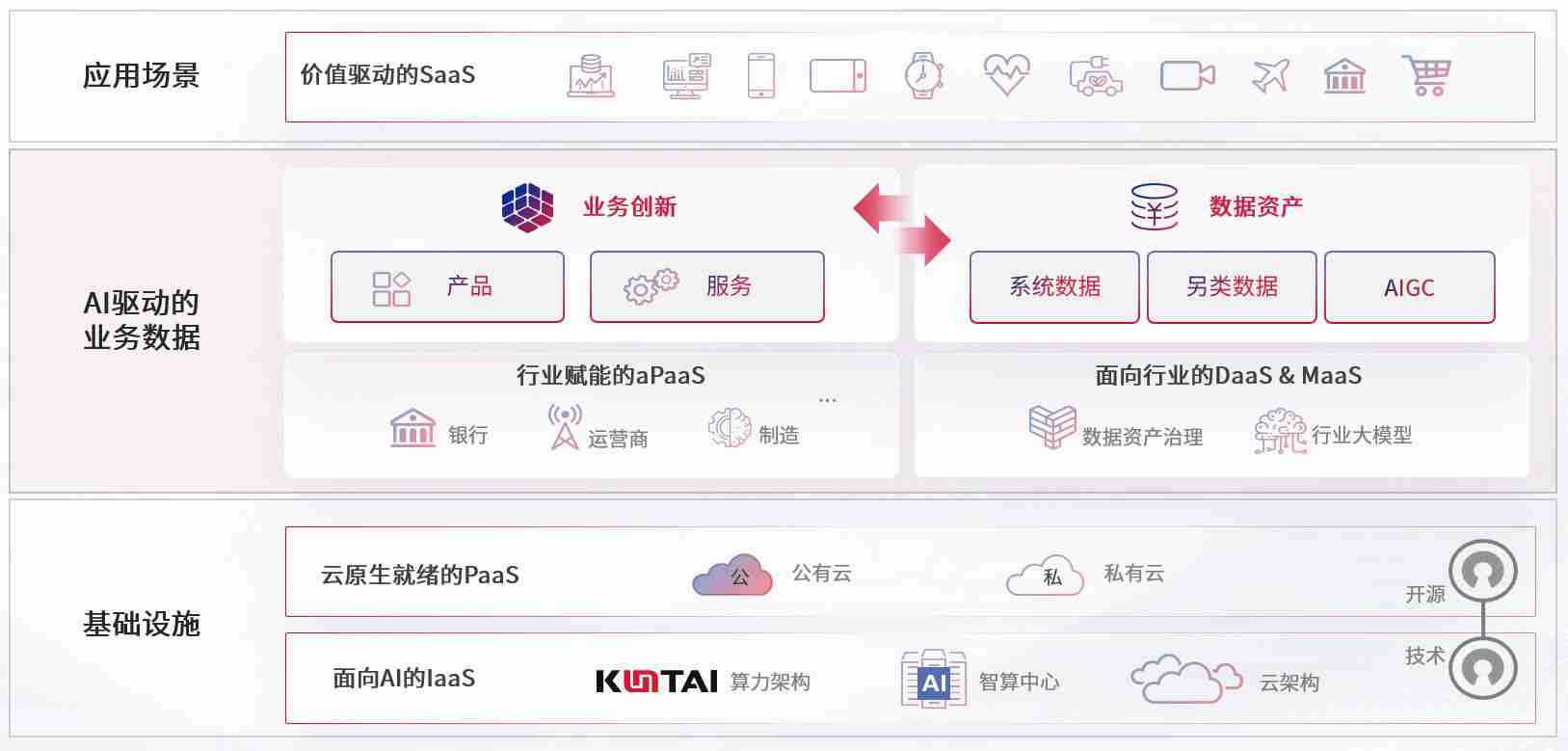 数字时代,,,围绕企业数字化转型的关键要素,,,亚洲必赢数码开创性的提出数云融合战略和技术体系框架,,,,着力在云原生、、数字原生、、AI原生和信创产业上架构产品和服务能力,,为处在不同数字化转型阶段的快消零售、、、、汽车、、、金融、、、医疗、、、、政企、、、教育、、、运营商等行业客户提供泛在的敏捷IT能力和融合的数据驱动能力,,,,构建跨界融合创新的数字业务场景和新业务模式,,助力企业级客户建立面向未来的核心能力和竞争优势,,全面推动社会的数字化、、、、智能化转型升级。。